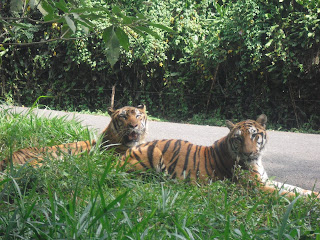 ließend die "Taman Safari Indonesia" besucht haben. Diese Safari war wirklich beeindruckend. Wir sind mit dem Auto direkt an den Tieren vorbei gefahren, denen zwar auch nicht viel mehr Platz zugeordnet war als in einem normalen Zoo, dafür gab es aber keine Zäune zur Straße hin. Indri hatte noch Erdnüsse gekauft mit denen man die Tiere anlocken konnte. Manchmal standen die aber auch schon einfach so mitten auf der Straße. Selbst die Tiger und Löwen kamen ziemlich nah ans Auto. Am Ende der Rundstrecke haben wir uns noch eine Delfinshow angeschaut und sind zu einem Wasserfall in der Nähe gelaufen.
